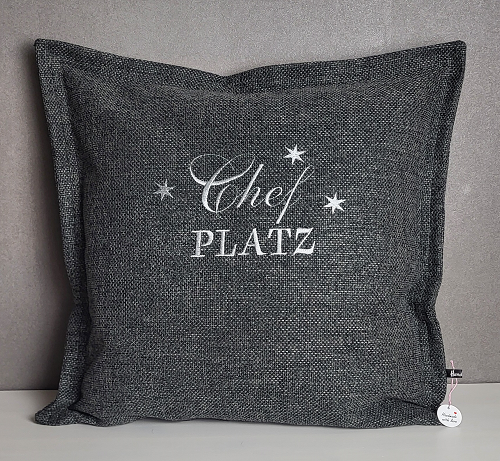 Die schöne Bestickung vom „Chefpatz“ auf dem großen Kissen ist ein Hingucker und ist ein schönes Accessoires auf jedem Sofa oder einem anderen Sitzmöbel.