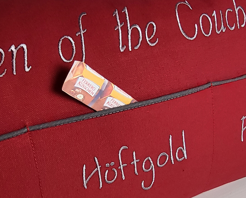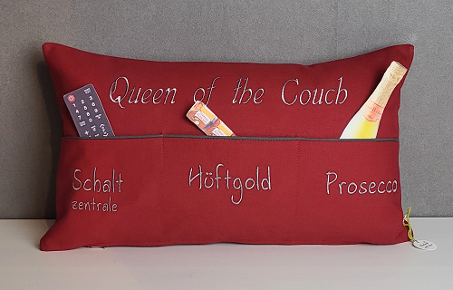 Das Kissen hat drei tolle Einsteckfächer für die wichtigsten Utensilien einer Frau. Das Kissen ist ein echter Hingucker auf jedem Sitzmöbel und ist ein tolles Unikat. Ein verdeckt eingenähter Reißverschluss befindet sich an der Unterseite der Kissenhülle. Die Pappdeko – Schaltzentrale, Hüftgold und Prosecco bekommst Du zum Kissen dazu.